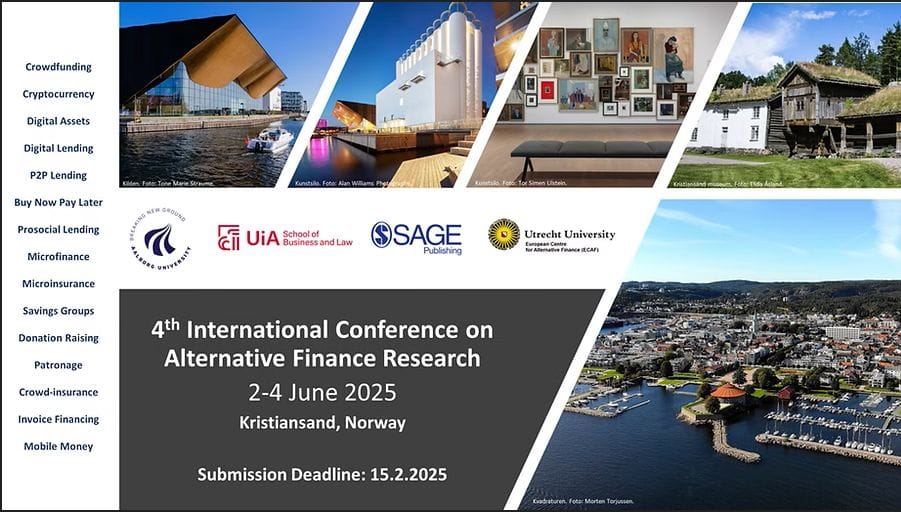 Ook dit jaar organiseren wij weer hét Europese congres voor onderzoek naar crowdfunding en andere vormen van non-bancaire financiering. Na eerdere edities in Utrecht (2017-2022), Gdansk (Polen) en Krems an der Donau (Oostenrijk), wordt het congres dit jaar georganiseerd van 2-4 juni in Kristansand in Noorwegen.