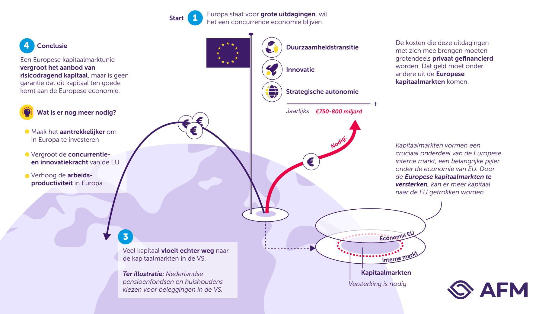 De Europese Commissie schat in dat we jaarlijks €750-800 miljard nodig hebben (4,4%-4,7% van het Europese BBP). Op zich hebben we in Europa ook voldoende beschikbaar kapitaal (Nederlandse pensioenfondsen alleen al beheren ruim €1500 miljard), maar deze fondsen worden geïnvesteerd in Aziatische en Amerikaanse markten. Pensioenfondsen, verzekeraars, maar ook particulieren meer laten investeren in Europese bedrijven gaat volgens de AFM alleen lukken als we een betere en efficiëntere kapitaalmarktunie gaan opzetten.