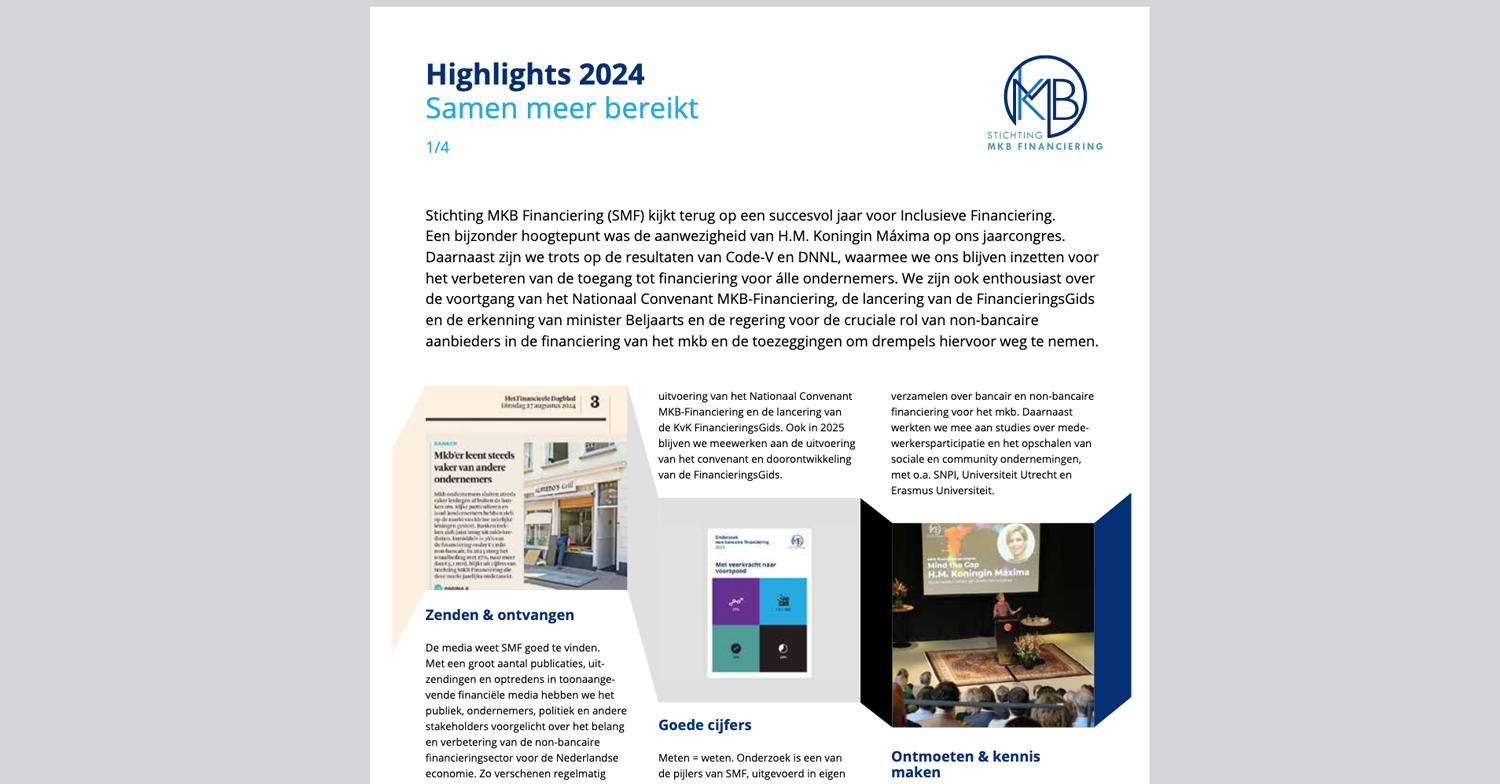 Stichting MKB Financiering kijkt terug op een succesvol jaar voor Inclusieve Financiering. Een bijzonder hoogtepunt was de aanwezigheid van H.M. Koningin Máxima op ons jaarcongres. Daarnaast zijn we trots op de resultaten van Code-V en DNNL, waarmee we ons blijven inzetten voor het verbeteren van de toegang tot financiering voor álle ondernemers.